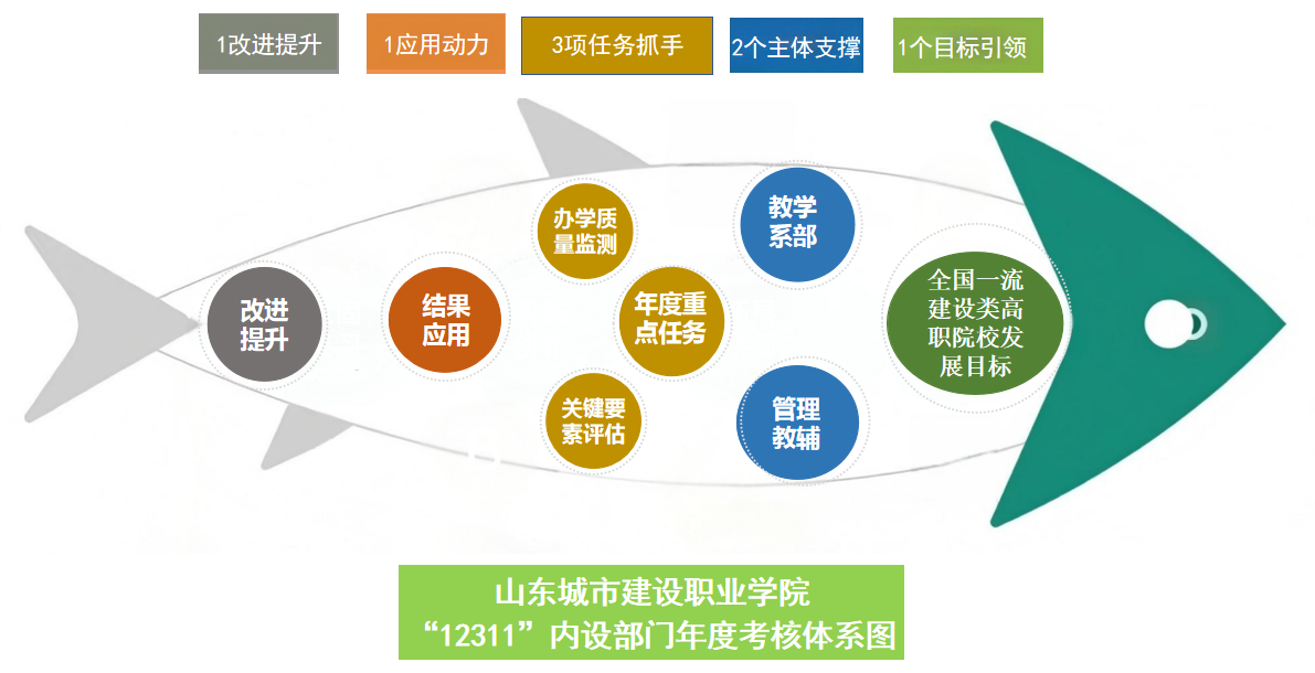 “1”以全国一流建设类高职院校发展目标为引领; “2”以教学系部、管理教辅考核主体为支撑; “3”以办学质量监测、关键要素评估、年度重点任务完成质量为抓手; “1”以考核结果应用为动力; “1”以优化改进促提升"。 |